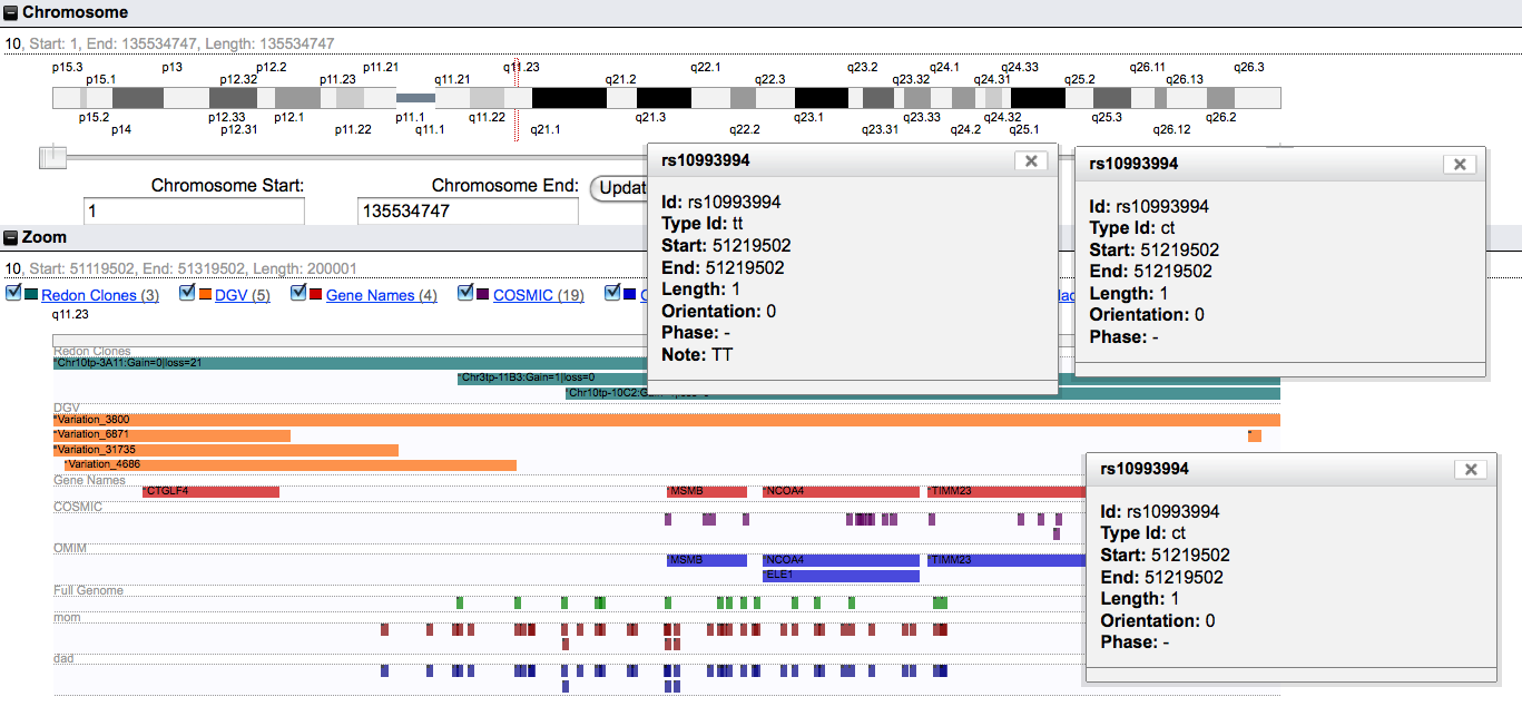 Up to that point I was not able to learn anything else from my genome. Making use of last Christmas’ offer in 23andMe, that offered genome analyses from $99 and the keen collaboration of my family, I was able to buy 23andMe analysis kits for my Mum, Dad, Sister and Aunt. It was only last week when I finally got the results back. I have now uploaded all of these genomes in the DAS protocol and hence can query them using myKaryoView.