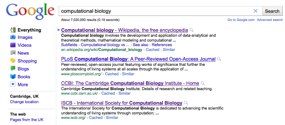 Wikipedia features as one of the resources with greatest impact in disseminating knowledge. A search in Google for computational biology returns the Wikipedia entry #1 in the hit list (Figure 1). A search for biological databases in Google, again, it returns the corresponding Wikipedia entry top of the list. Search for genomics, proteomics or metabolomics. Still, the top result is Wikipedia.