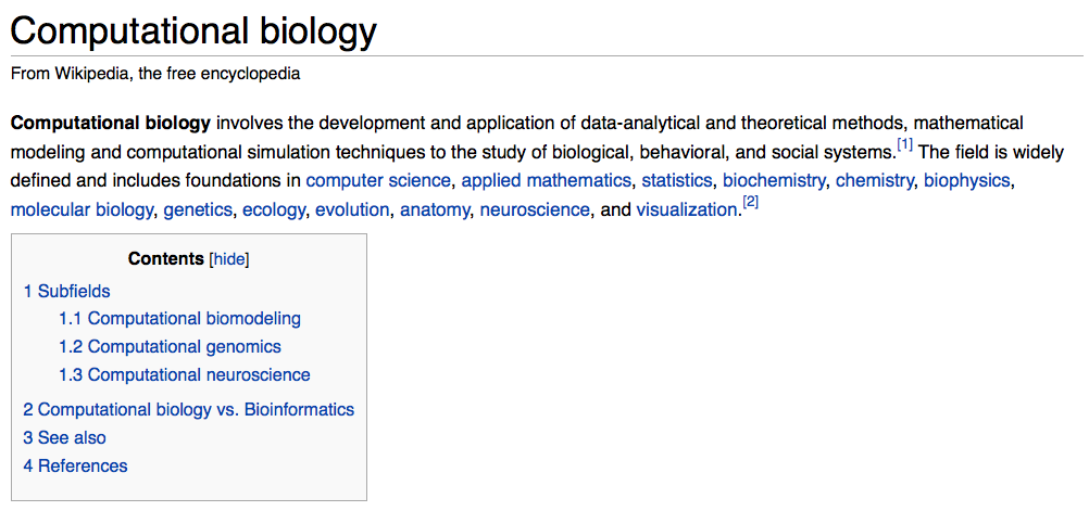 Figure 2 shows a snapshot of the current computational biology article in Wikipedia. It does not mention any of the breakthroughs the field has experienced since the advent of the Human Genome Project or Journals or even Scientists who have shaped the field.