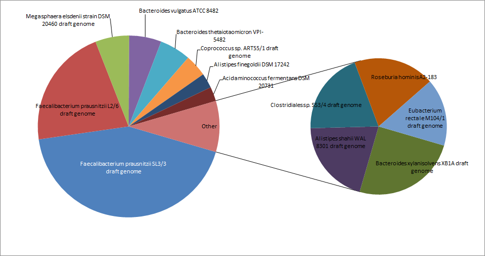 After my initial call for crowdsourcing the analysis of my personal fecal DNA, I had some results sent back via Twitter from Willy Valdivia at Orion Biosciences. Thank you very much for that. Willy kindly sent me a couple of figures, the first one above shows a random piece of Sample 1 of my personal fecal sample and the second figure below a histogram with the percentage of DNA for top 25 organisms for my fecal sample.